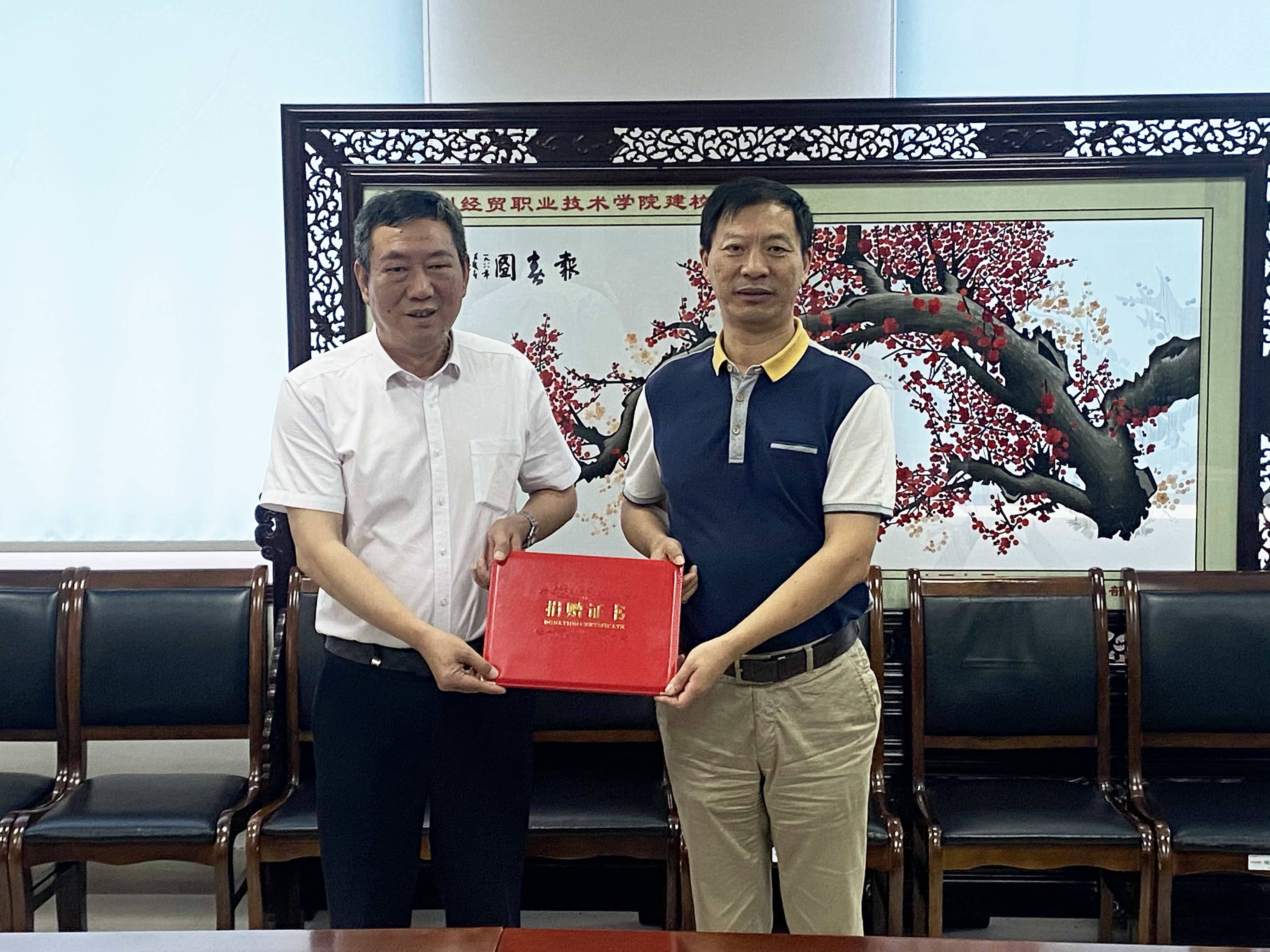 最后,雙方進行了捐贈物資的交接,蘇州經貿職業技術學院副院長沈文其向企業頒發了捐贈證書,并合影留念。