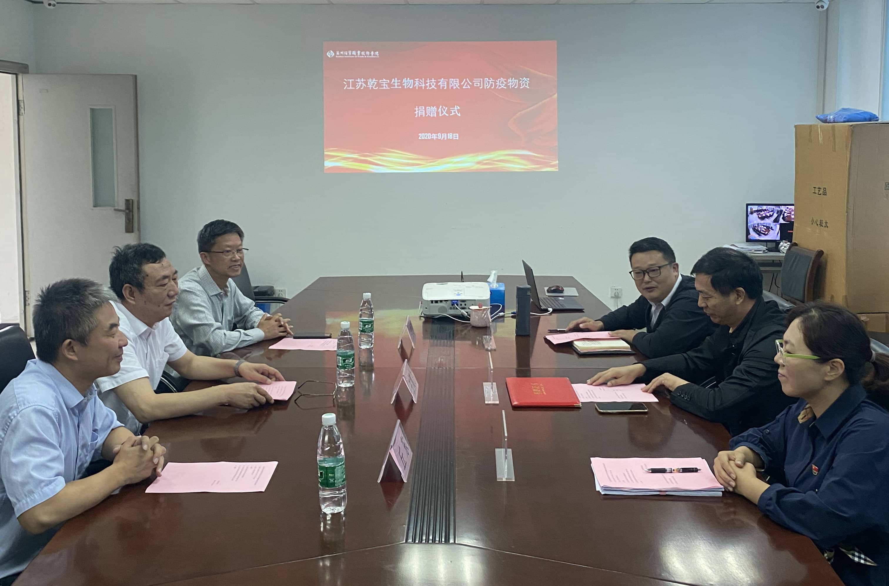 2020年9月18日上午,江蘇乾寶生物科技有限公司(簡稱“乾寶生物科技”)防疫物資捐贈儀式在蘇州經貿職業技術學院行政樓舉行,江蘇乾寶集團總裁王翼寧、江蘇乾寶生物科技有限公司總經理丘東、太湖書院執行院長王建明、蘇州經貿職業技術學院副院長沈文其、后勤管理處處長蔡達君、后勤管理處科長陸體艷出席了捐贈儀式。蔡達君處長主持了捐贈儀式,并介紹了出席儀式的嘉賓。