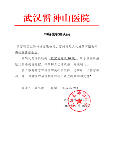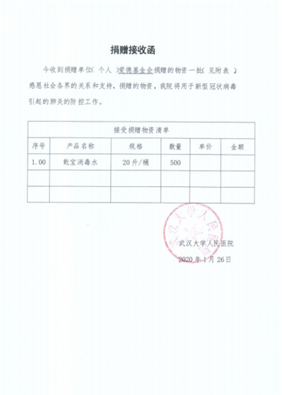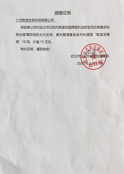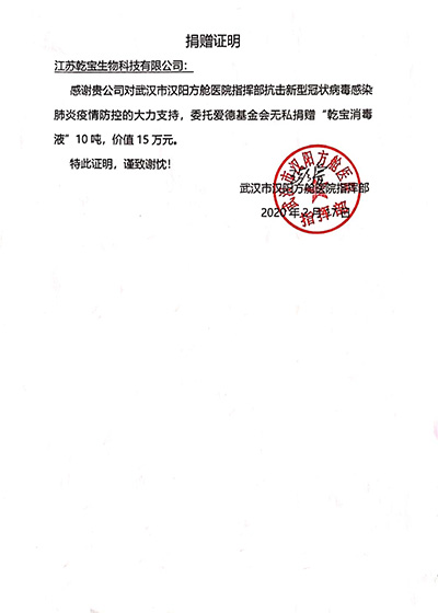 武漢市漢陽方艙醫(yī)院捐贈證書