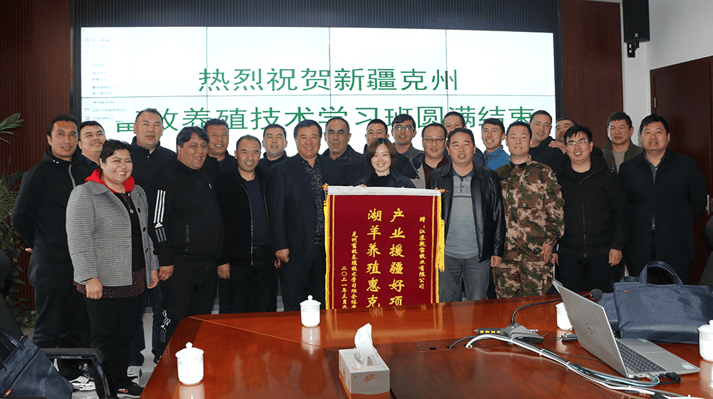 3月19日上午,江蘇乾寶牧業公司會議室里,洋溢著歡樂友好的氣氛,乾寶牧業司總裁蔣柏林熱情地與來自新疆克孜勒蘇柯爾克孜自治州19位學員親切座談,回答了學員們提出的湖羊養殖政策、管理和技術方面的問題,學員們感到受益匪淺。座談結束后,學員代表將一面印有“產業援疆好項目,湖羊養殖惠克州”金字錦旗贈送給乾寶牧業公司,以表達他們的感激之情。