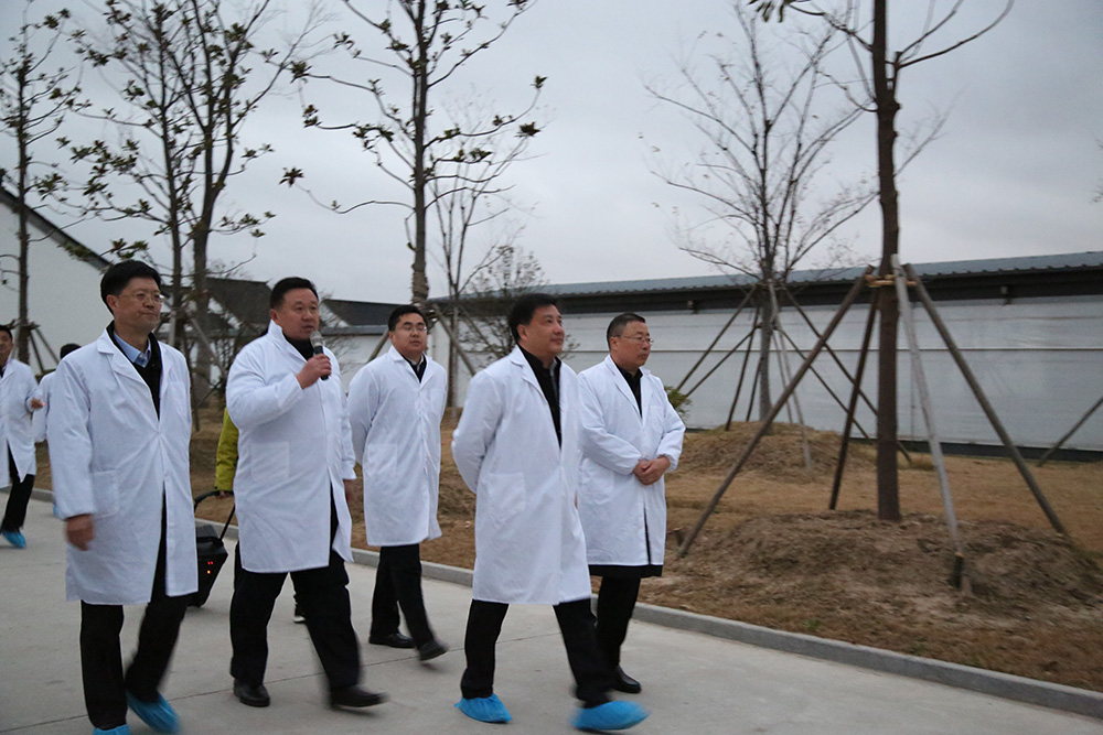 ??王躍程董事長、王榮華總裁陪同印臺區委書記趙富祥及亭湖區委書記李東成一行參觀廠區,介紹我司在扶貧助困方面采取與亭湖區政府聯合打造的“羊去羊回”精準扶貧模式。