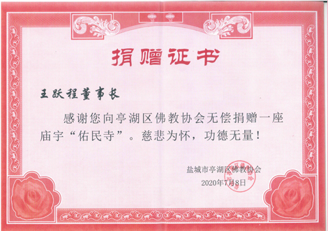 佑民寺捐贈榮譽證書