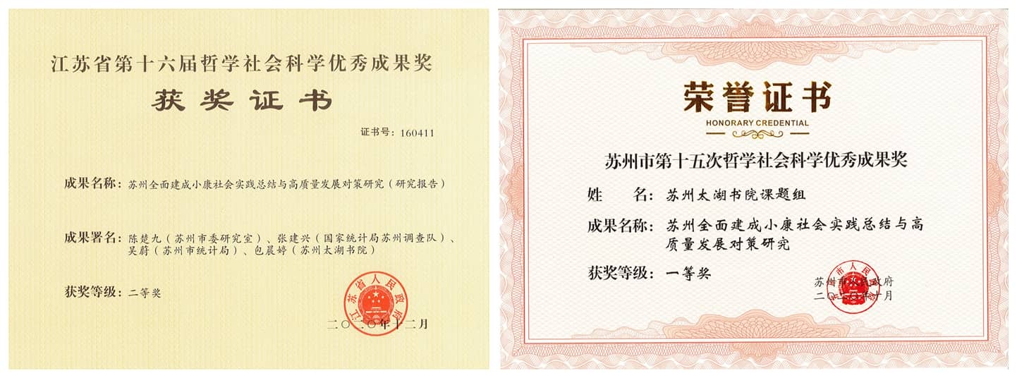 此次評獎,太湖書院課題組憑借《蘇州全面建成小康社會實踐總結與高質量發展對策研究》(研究報告)榮獲江蘇省第十六屆哲學社會科學優秀成果獎二等獎、蘇州市第十五次哲學社會科學優秀成果獎一等獎。