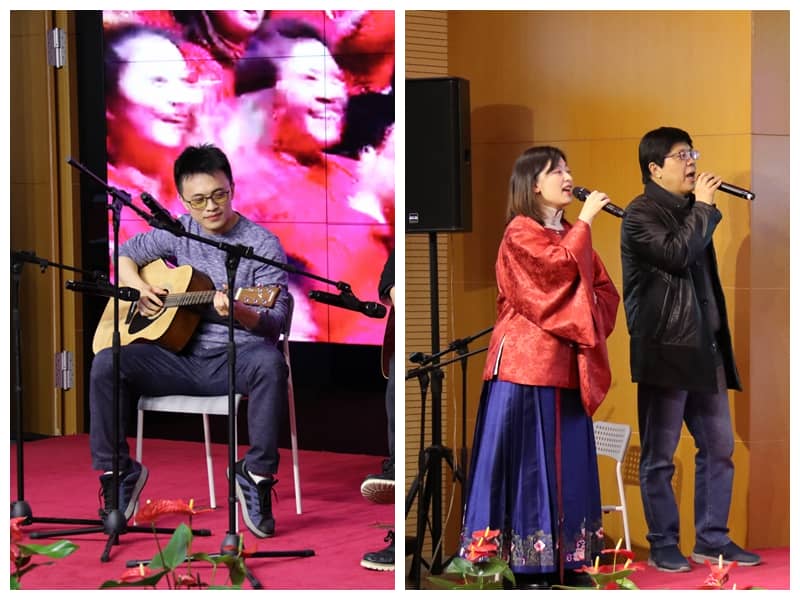 會(huì)上集團(tuán)還精心組織了新年聯(lián)歡活動(dòng)。集團(tuán)各公司員工踴躍參加,多才多藝的乾寶人們精彩表演了歌曲演唱、口琴吹奏、黑管演奏、吉他彈奏、古琴演奏等精彩節(jié)目。最后,大家共同祝愿乾寶的明天更加美好,大會(huì)在《眾人劃槳開(kāi)大船》的大合唱中圓滿結(jié)束。?