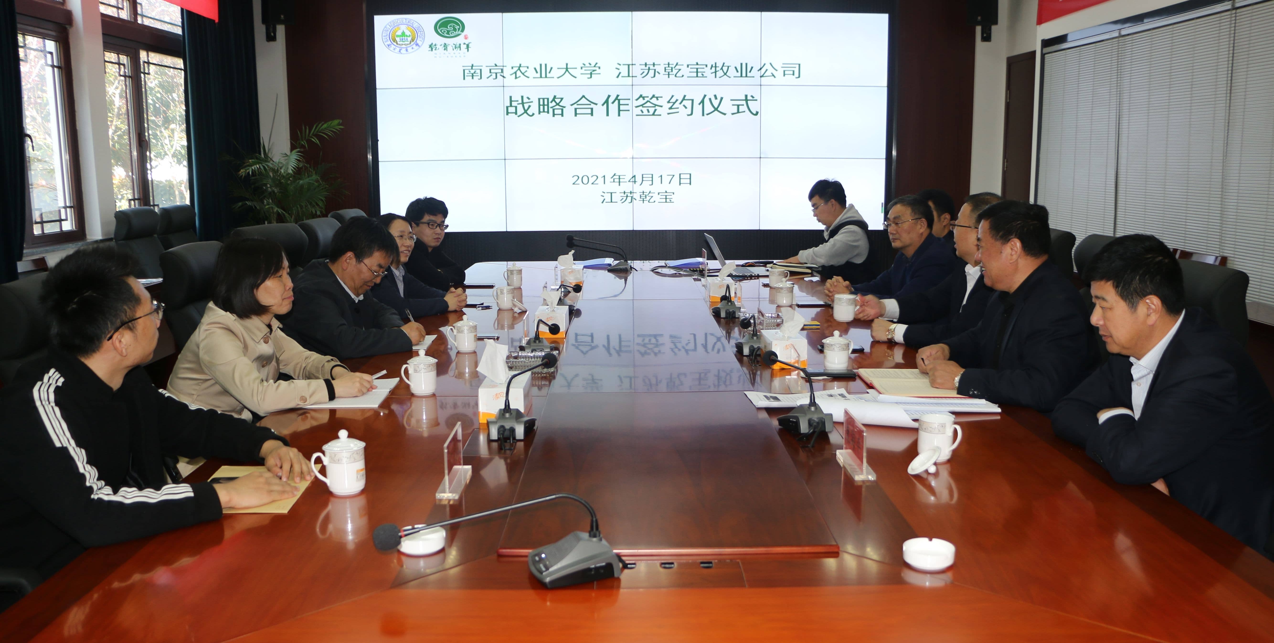 簽約儀式前,蔣柏林總裁向各位專家教授匯報了乾寶牧業公司湖羊種業工程開展情況,以及乾寶湖羊保種、選育、核心種群今后發展方向、具體實施計劃,希望利用與南農戰略合作的機會,借助于南京農業大學科研、人才、項目等方面的優勢,促進乾寶在湖羊種質保護、發展上有新的突破。