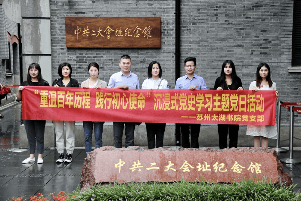 2021 年是慶祝中國共產黨成立 100 周年的重大吉慶之年。為進一步增強基層黨員的責任感、使命感和榮譽感,引導黨員“學黨史、悟思想、辦實事、開新局”,太湖書院黨支部開展“重溫百年歷程,踐行初心使命”沉浸式黨史學習主題黨日活動。在黨支部書記劉斌同志的帶領下,全體黨員、預備黨員和積極分子到上海進行了現場學習。 上午,大家一同參觀了四行倉庫抗戰紀念館。場館通過版面和實物陳列,結合戰斗場景、沙盤模型、微縮景箱、油畫雕塑、互動游戲和影視片段等展示手段,再現了“四行倉庫保衛戰”的英雄歷史。大家重溫了廣大愛國官民前赴后繼、同仇敵愾血鏖淞滬的偉大歷史,深刻體會了以謝晉元為代表的“八百壯士”堅守四行英勇殺敵的無畏精神和孤軍抗日、不屈不撓的民族氣節。
