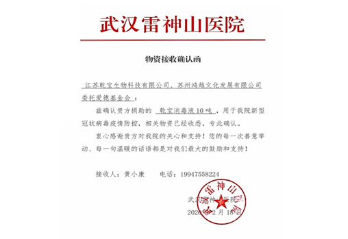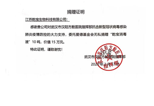 2020年1月以來,新型冠狀病毒Covid-19疫情肆虐湖北武漢并波及全國,乾寶生物科技作為一家有社會責任感的企業,積極響應黨中央和國務院號召,迅速做出反應,放棄春節假期,快速組織員工突擊生產防疫一線急需的消毒產品,于1月25日大年初一向武漢市捐贈10噸乾寶®消毒液,并交付給湖北省人民醫院和中國人民解放軍空降兵醫院投入使用;隨后又向武漢雷神山醫院和武漢國博方艙醫院捐贈20噸乾寶®消毒液。公司已先后向中國航天、北京市慈善義工聯合會、湖北省軍區、南京地鐵集團、江蘇省13個地市教育系統、蘇州市衛健委及下屬13家醫院、蘇州軌交集團、鹽城市政府、四川德陽市政府、加納共和國、巴基斯坦共和國、盧旺達共和國等國家和地區捐贈超過200噸、市場價值逾千萬的乾寶®消毒液。所捐贈的乾寶®消毒液主要用于各地的醫院、學校、公共場所、軌道交通、農貿市場等地方的消毒殺菌,抗擊疫情。