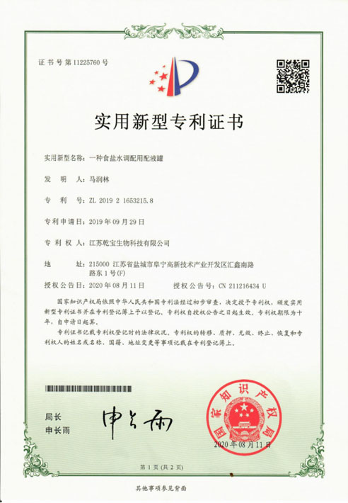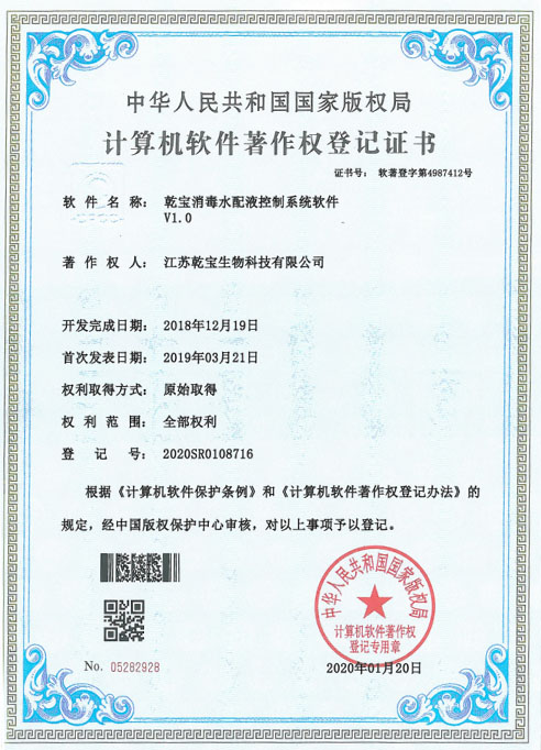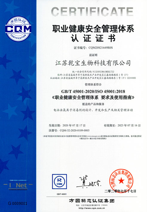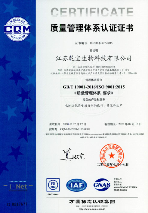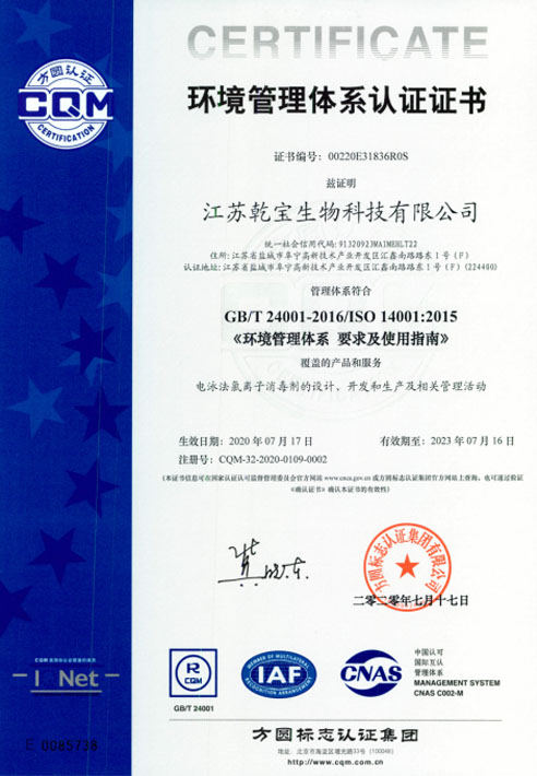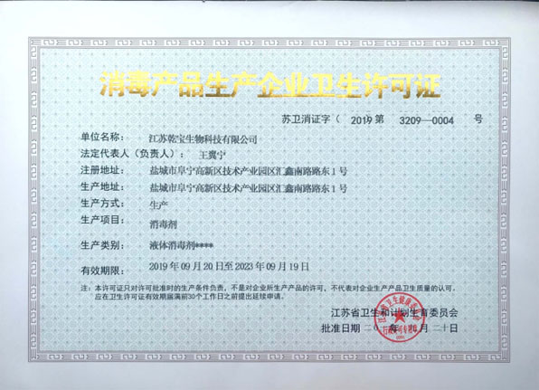 江蘇乾寶生物科技有限公司(簡稱“乾寶生物科技”)位于江蘇省阜寧高新技術產業園區,是一家專業研發和生產消毒殺菌類產品的科技企業。公司技術力量雄厚,擁有多項專利,資質齊全,已通過國家質量管理體系(ISO 9001)、職業健康安全管理體系(ISO 45001)和環境管理體系(ISO 14001)三大體系認證。自2016年初成立以來,公司秉持質量可靠、用戶至上、誠信經營的理念,立足長遠,銳意進取,向廣大消費者提供安全環保的乾寶®消毒液,保障人民的生命健康。